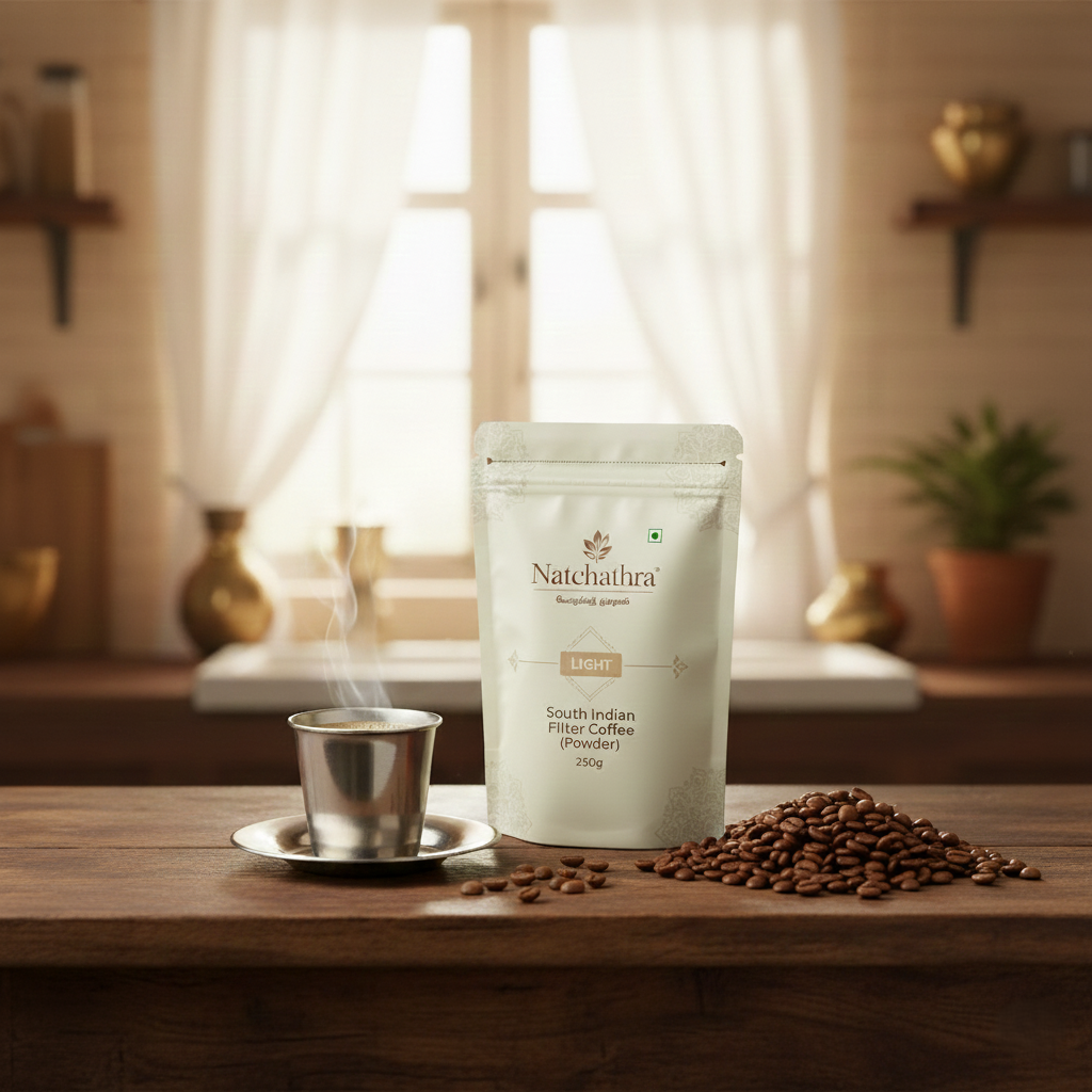 Perfect for those who enjoy a gentle and smooth cup of coffee, this light blend delivers authentic South Indian flavor with mild strength. Finely ground for easy decoction and a refreshing coffee experience.